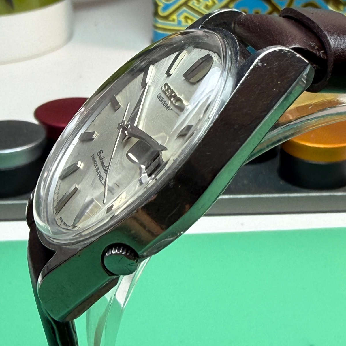 Dans les sixties, Seiko savait construire des montres d’une qualité redoutable à des prix accessibles. Le calibre 6218, flagship de la gamme Seikomatic à sa sortie en 1964, est directement ancêtre des premiers Grand Seiko automatiques Hub City Vintage — un sacré pedigree. D’ailleurs, un coup d’œil rapide et on jure voir un Grand Seiko : même vocabulaire de design, index anguleux, aiguilles bistouri. Tout ça sans le prix qui va avec.